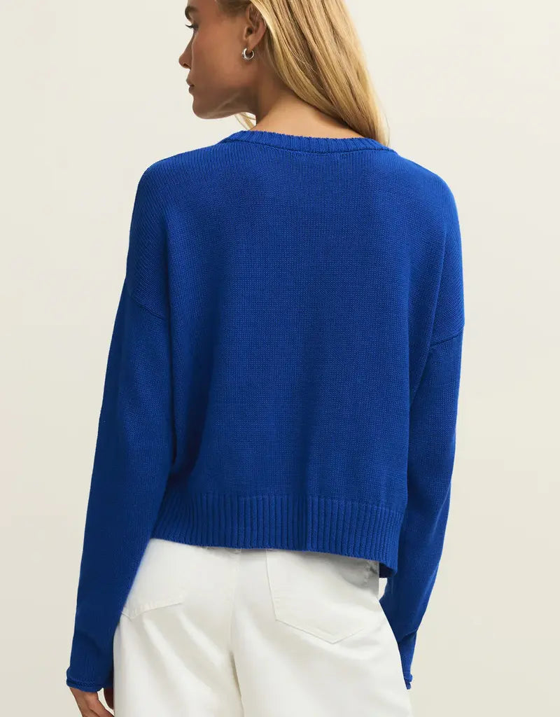 Le pull Sienna Palm est une pièce adorable et originale ! On adore ce magnifique bleu cobalt ! Les palmiers évoquent instantanément les vacances !
