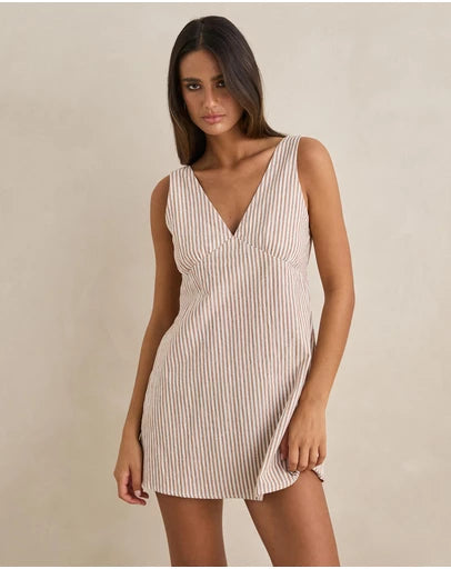À la fois féminine et décontractée, la mini-robe Valley Stripe couleur camel présente une coupe trapèze et de délicats froncements sous la poitrine. Son décolleté en V devant et dos, associé à un lien ajustable dans le dos, crée une silhouette estivale flatteuse.