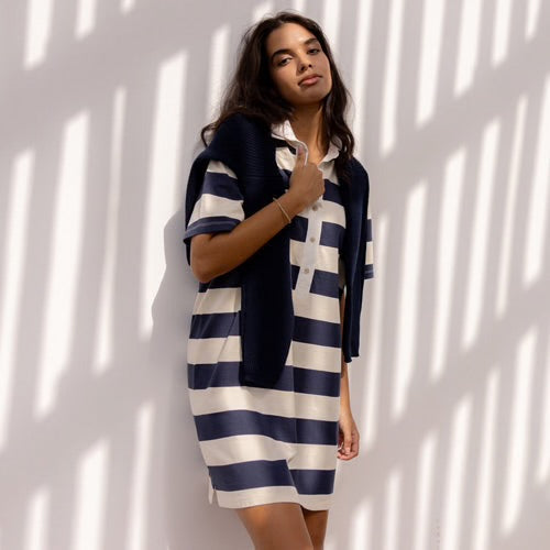 La robe Colbie est confectionnée en jersey de coton à rayures rugby classiques. Elle présente un col contrastant, une demi-patte de boutonnage et des fentes latérales.